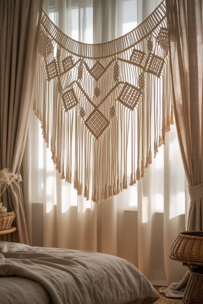 You can attach a macramé panel over sheer white curtains for privacy while keeping the boho look soft and layered.