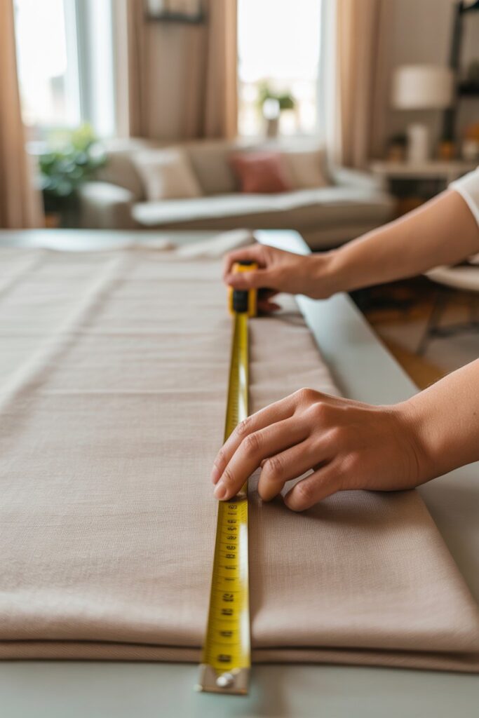 Start by measuring your window’s height and width. I always add 4–6 inches to the width for fullness and 6–8 inches to the height for hems.