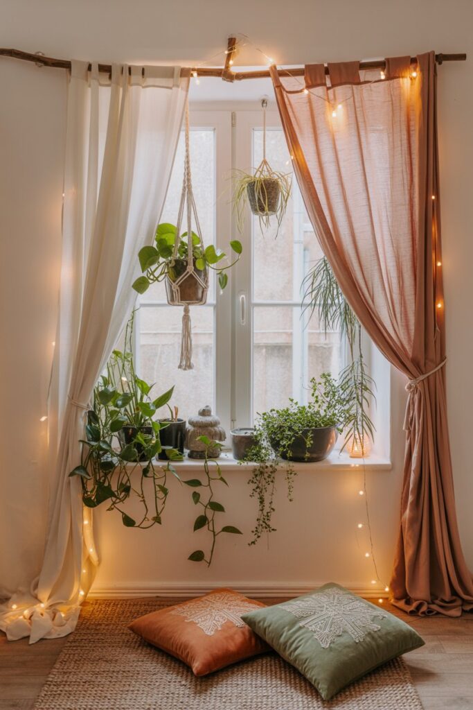 - Layer plants, fairy lights, or beaded garlands near the window.