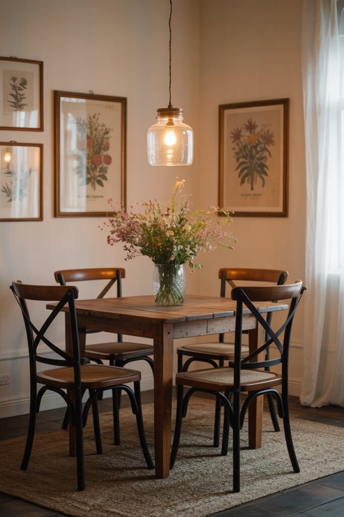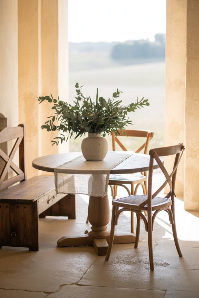 If you’re really tight on space, consider drop-leaf tables that expand when needed or wall-mounted foldable tables paired with farmhouse stools. Keep décor simple with a linen table runner, a ceramic vase of greenery, and a rustic wooden tray.