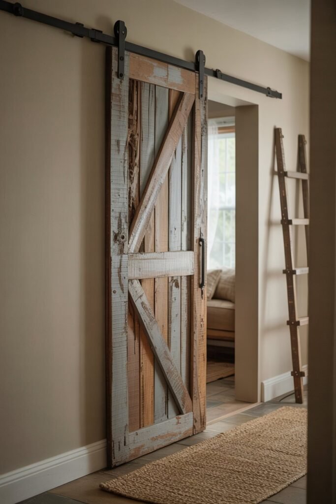 Choose reclaimed wood or distressed finishes for a classic farmhouse look. Black hardware adds an industrial edge, while white painted barn doors keep things bright and airy.