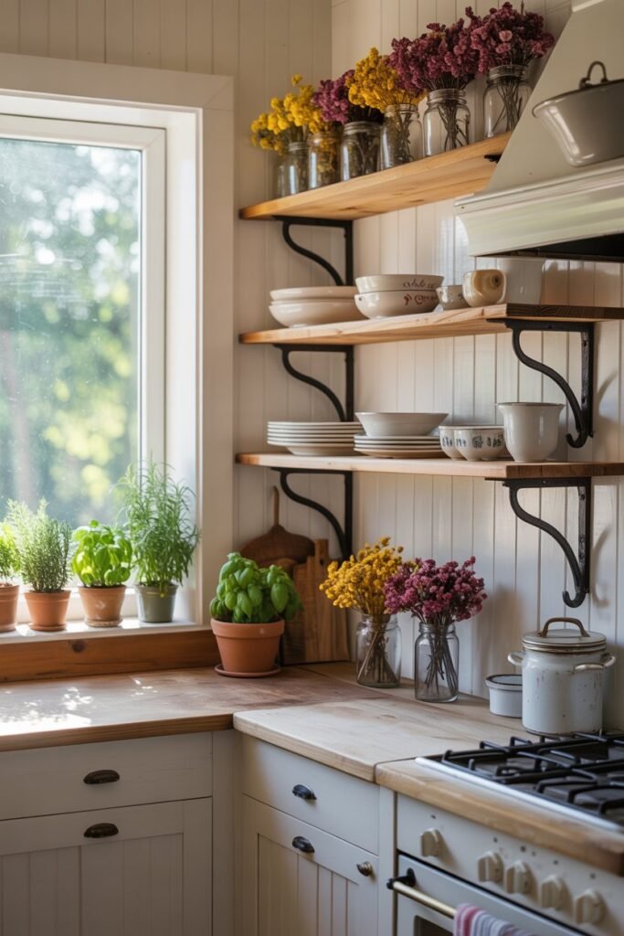 When floor space is tight, walls become your best friend. Open shelving is a staple of farmhouse style and works perfectly in small spaces because it draws the eye upward while adding functional storage.