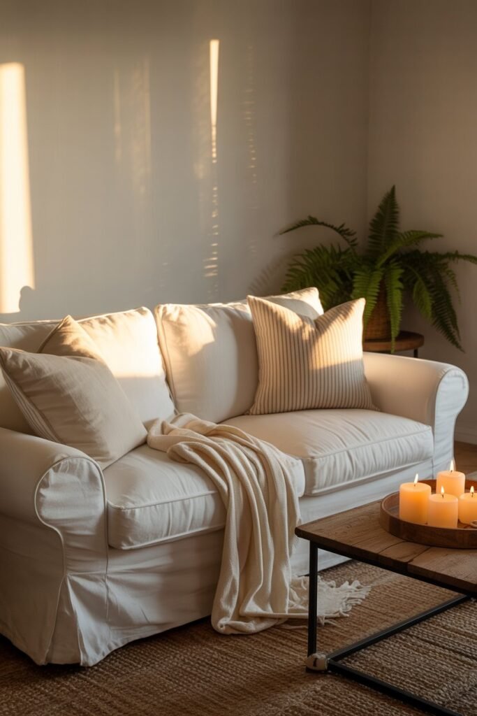 - Neutral slipcovered sofas with washable covers (IKEA, Pottery Barn)