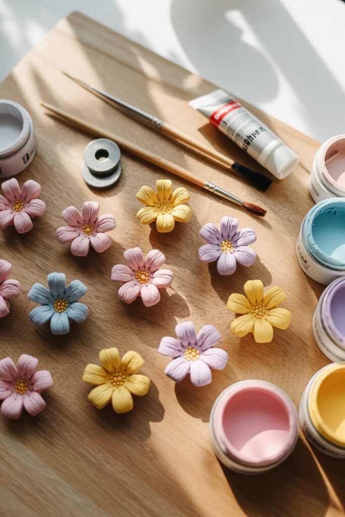 After the clay has hardened, paint the petals using bright spring colors like yellow, pink, lavender, or soft blue. Let the paint dry completely.