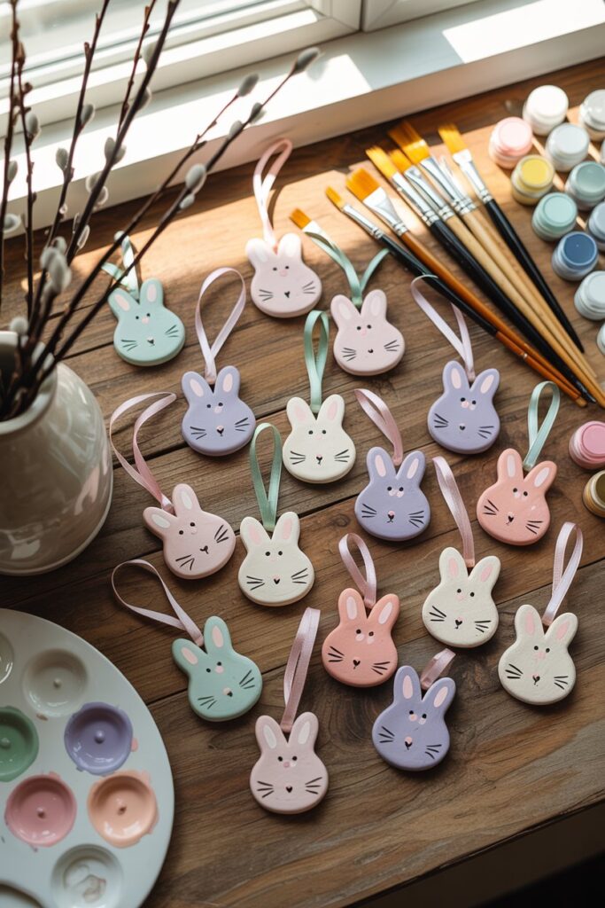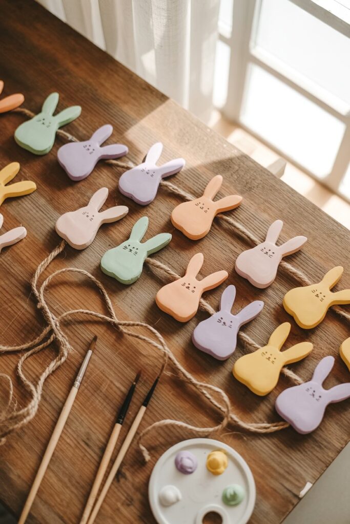 Once dry, paint them with pastel colors such as soft pink, mint green, or light yellow. After the paint dries, thread twine or ribbon through the holes to connect each bunny.