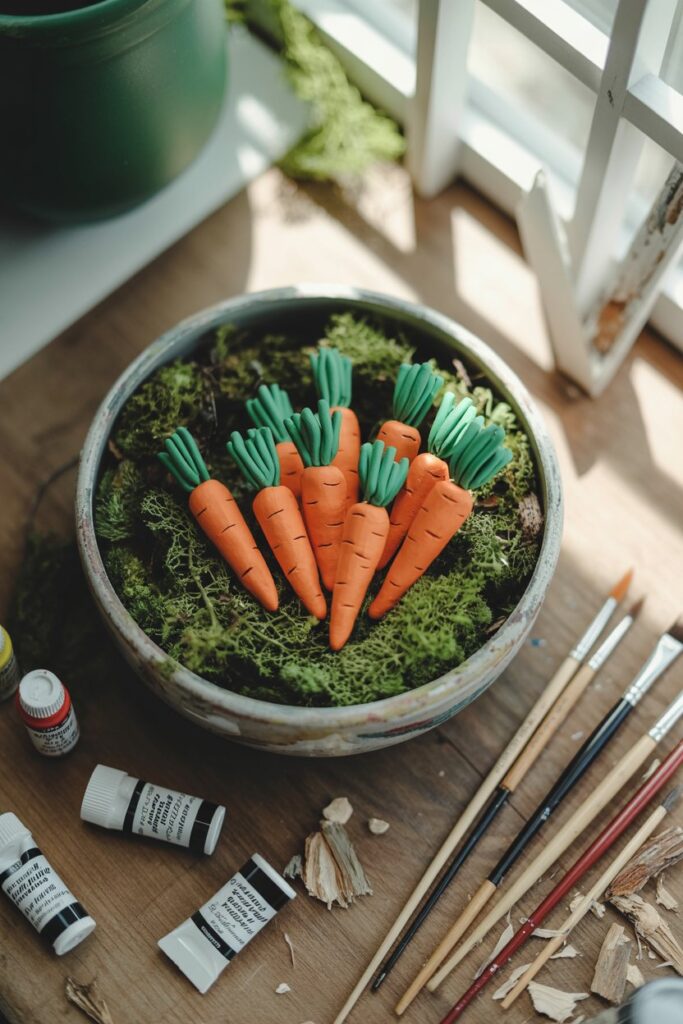 Place several clay carrots in a decorative bowl filled with moss for a simple spring decoration.