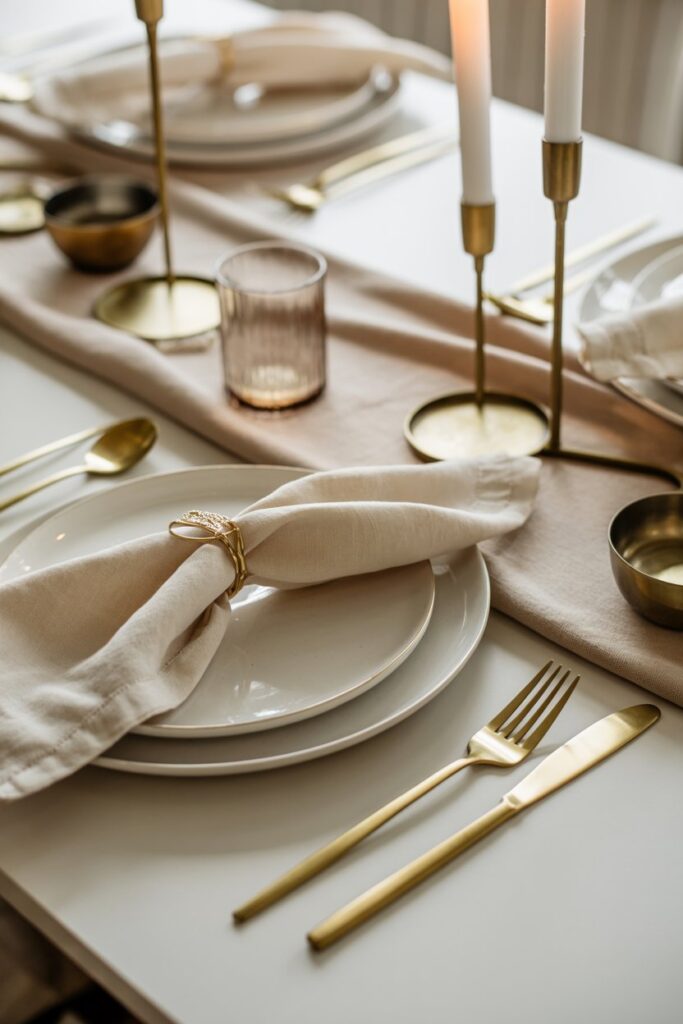 Balance the look with a few thoughtful accents like gold-rimmed glasses or simple metallic napkin rings to create a soft, cohesive glow across the table.