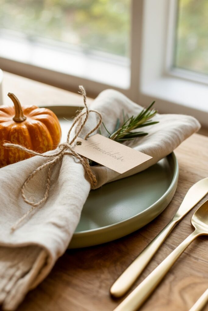 Write each guest’s name on a tag and attach it to a mini pumpkin, pinecone, or sprig of rosemary.