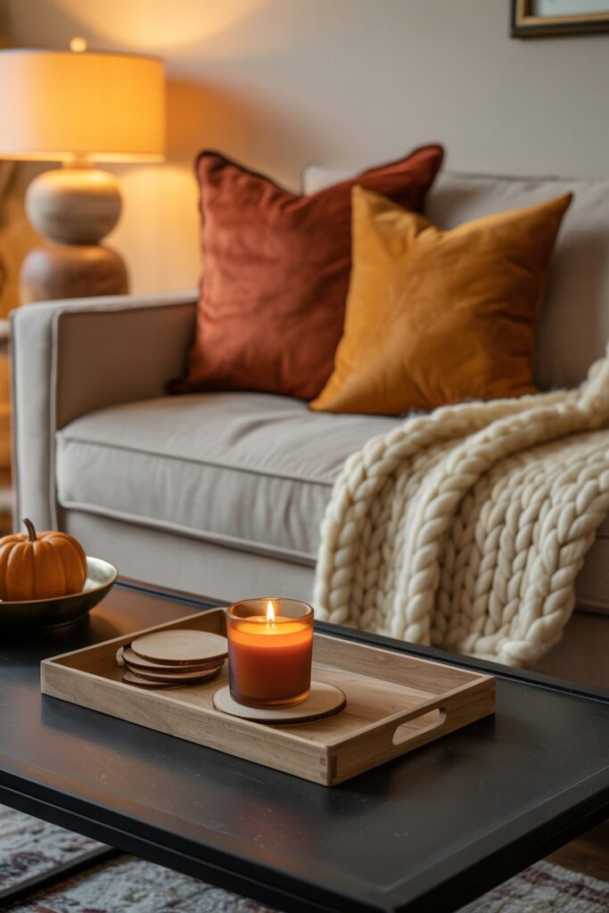 Drape a chunky knit or faux fur throw over the sofa for instant warmth, and finish the space with a softly scented candle like pumpkin spice or vanilla to create a comforting atmosphere.