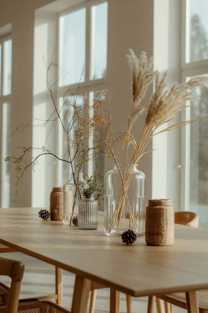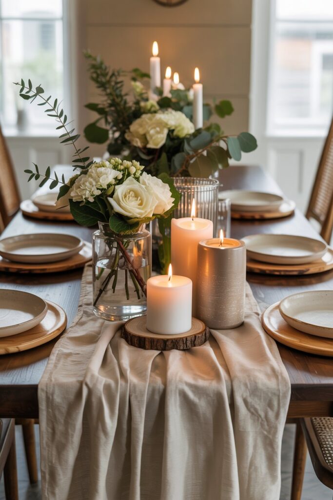 A thoughtfully styled centerpiece makes the entire space feel intentional and warm, setting the mood for a memorable meal without feeling overdone or fussy.