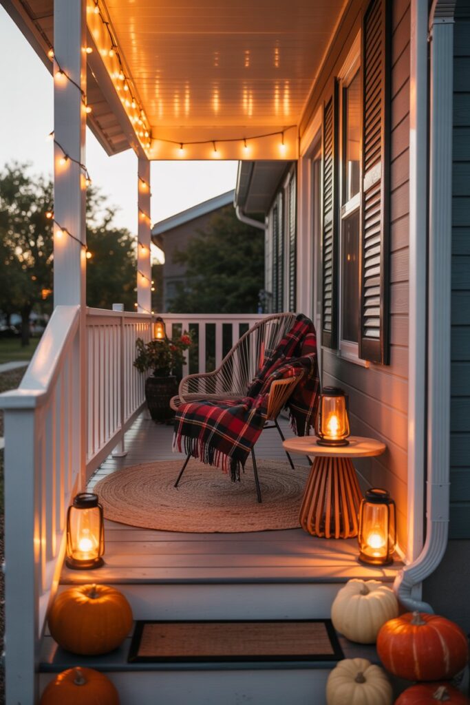 Place solar lanterns or glowing pumpkins along the steps. Add a plaid throw over a chair for extra charm.