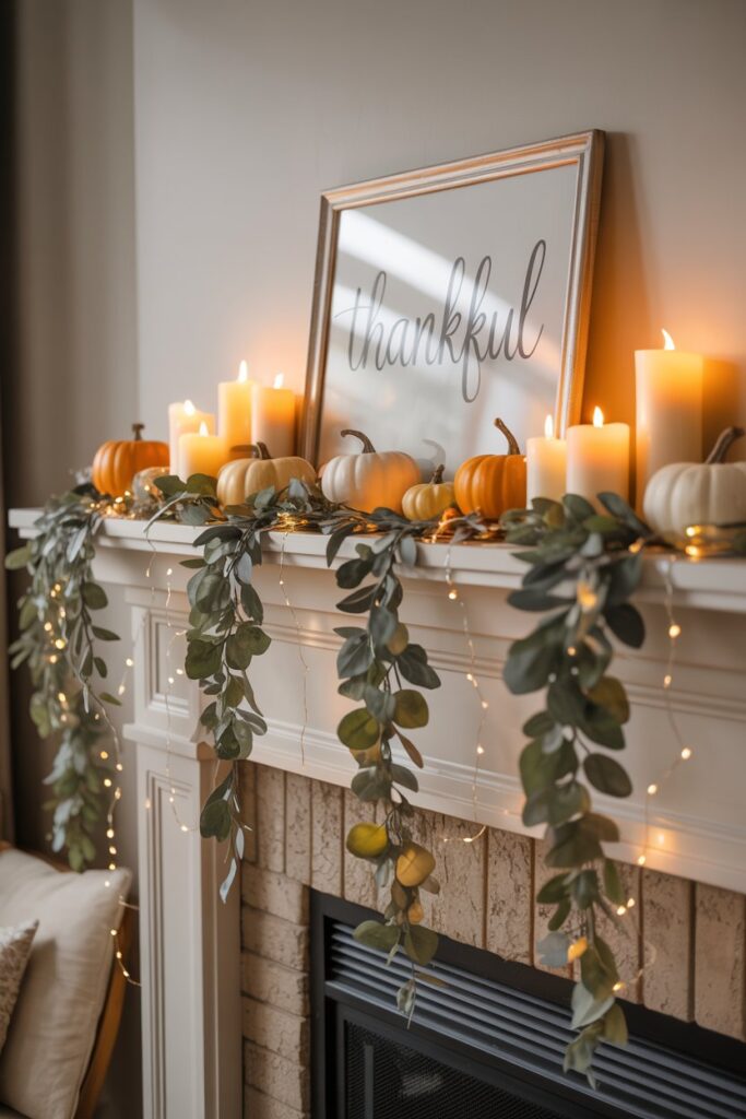 Add pumpkins, candles, and a framed Thanksgiving quote for personality.