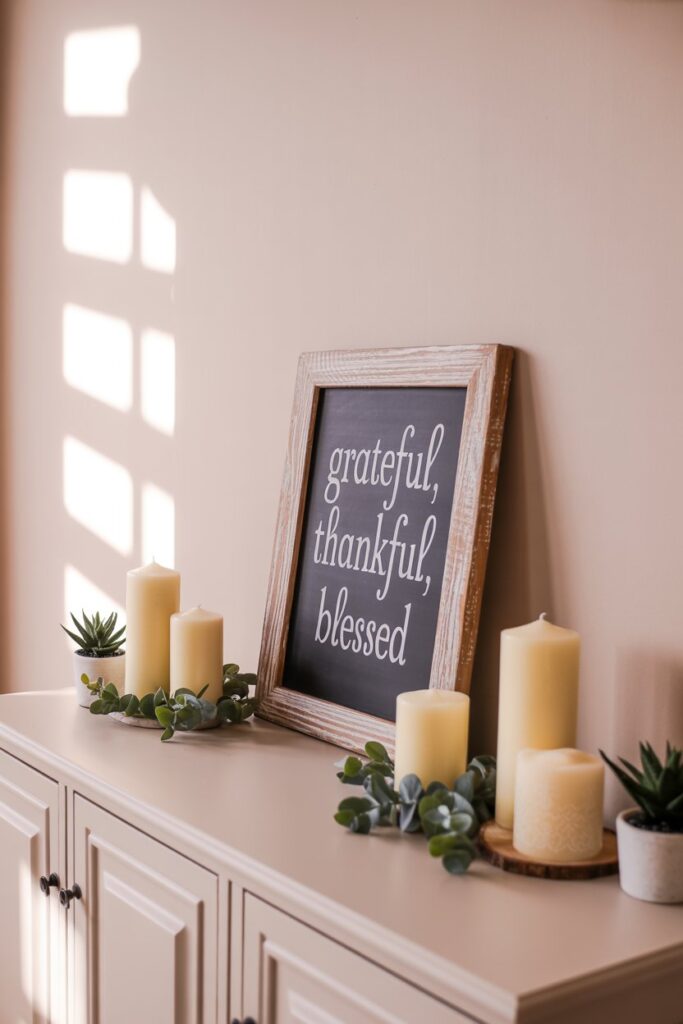 Choose a small chalkboard, framed print, or letterboard with phrases such as “Gather & Give Thanks” or “Grateful, Thankful, Blessed.”