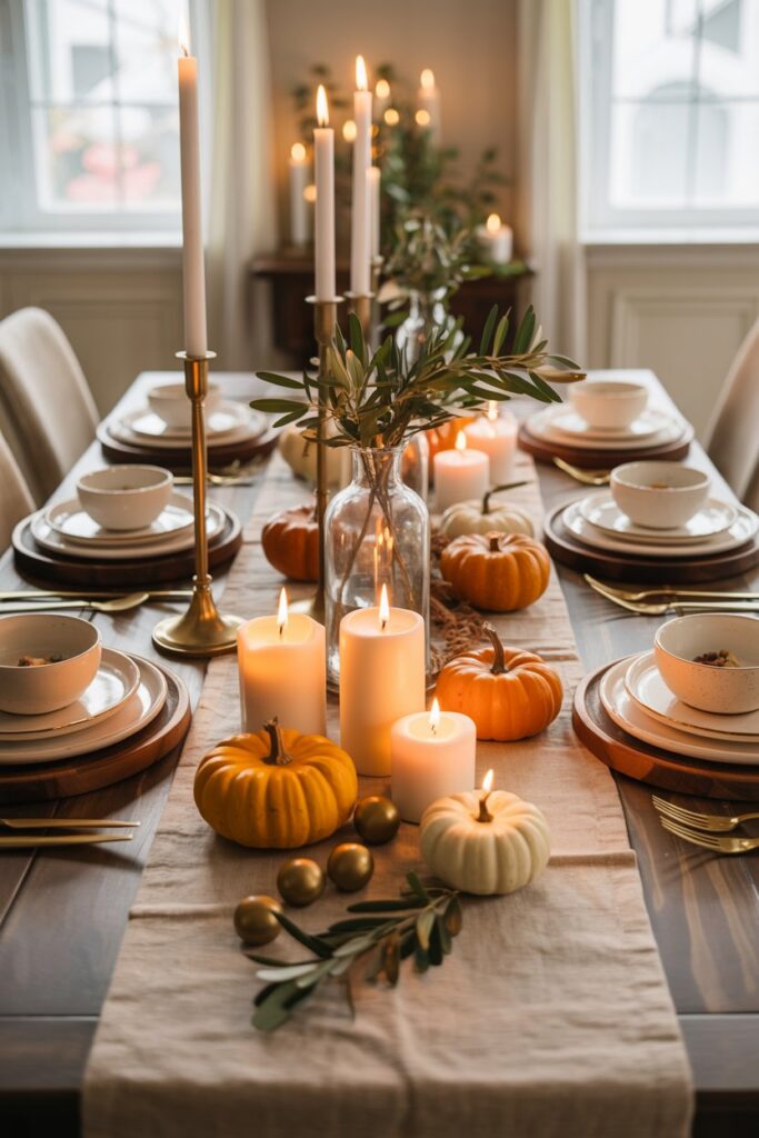 Layer a mix of pumpkins, greenery, and candles down the center of the table.