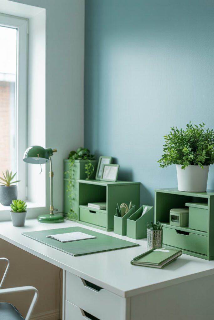 Stick to one or two primary colors and a complementary accent to create a harmonious workspace.