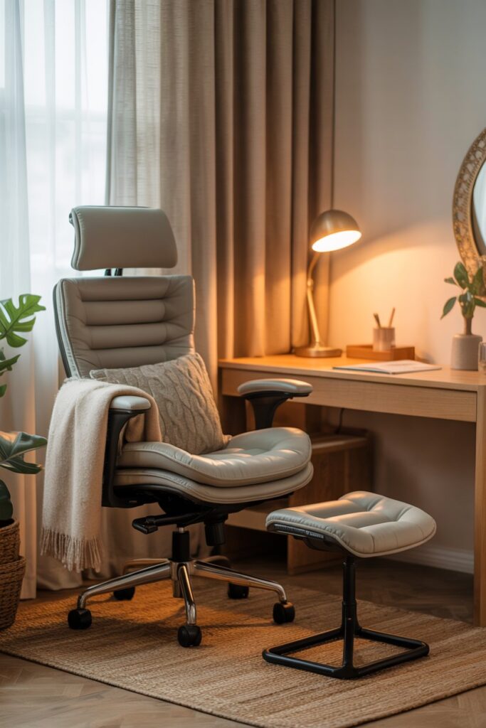 Add a footrest or cushion if needed. Keep your workspace temperature comfortable, and include small cozy elements like a throw or pillow that do not clutter the area.