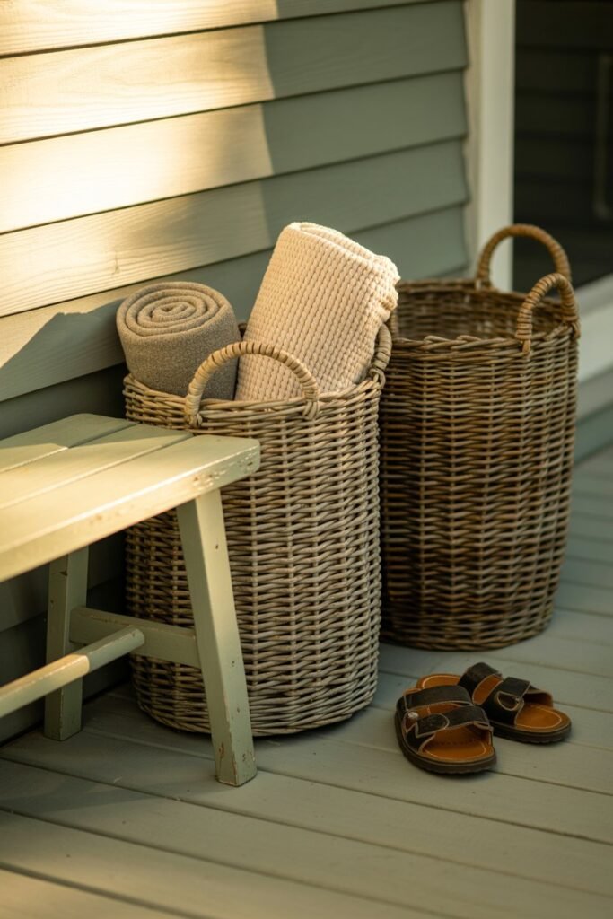 Baskets are not just for indoors, they are perfect for keeping porch clutter organized while adding texture.