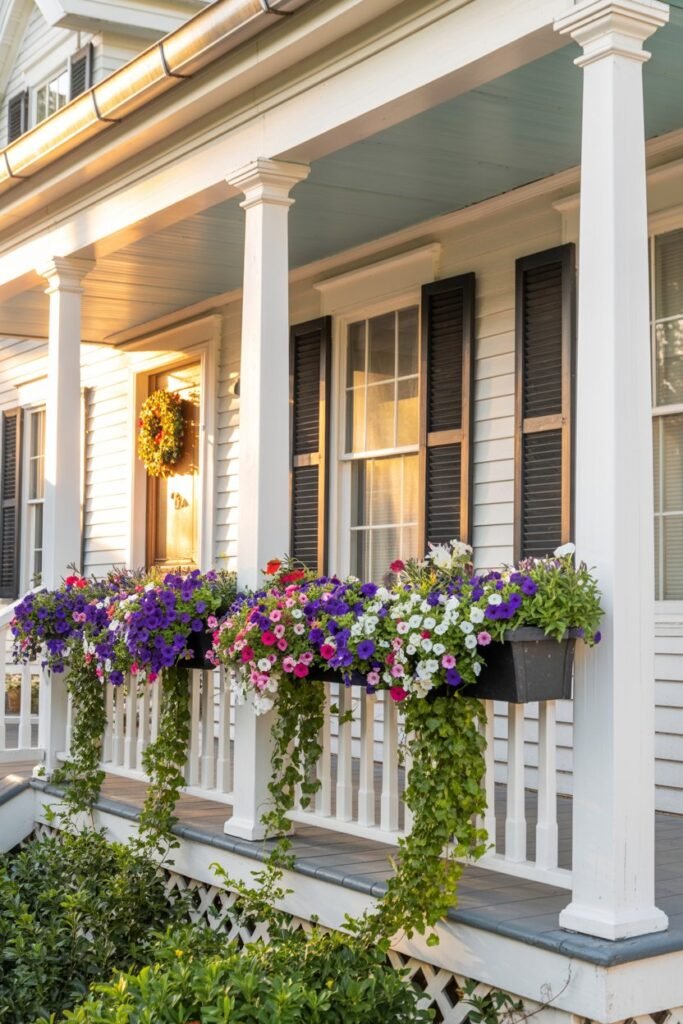 Attach window boxes under your porch windows. Choose trailing plants like ivy or petunias for a full look. Don’t forget to water regularly or add self-watering inserts if you’re busy.