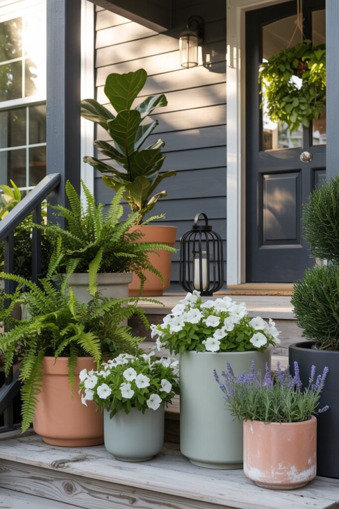 Group 3–5 planters in different sizes near your door. Mix textures — a leafy fern, a flowering plant, and maybe one tall grass or fiddle leaf fig if you’ve got shade.