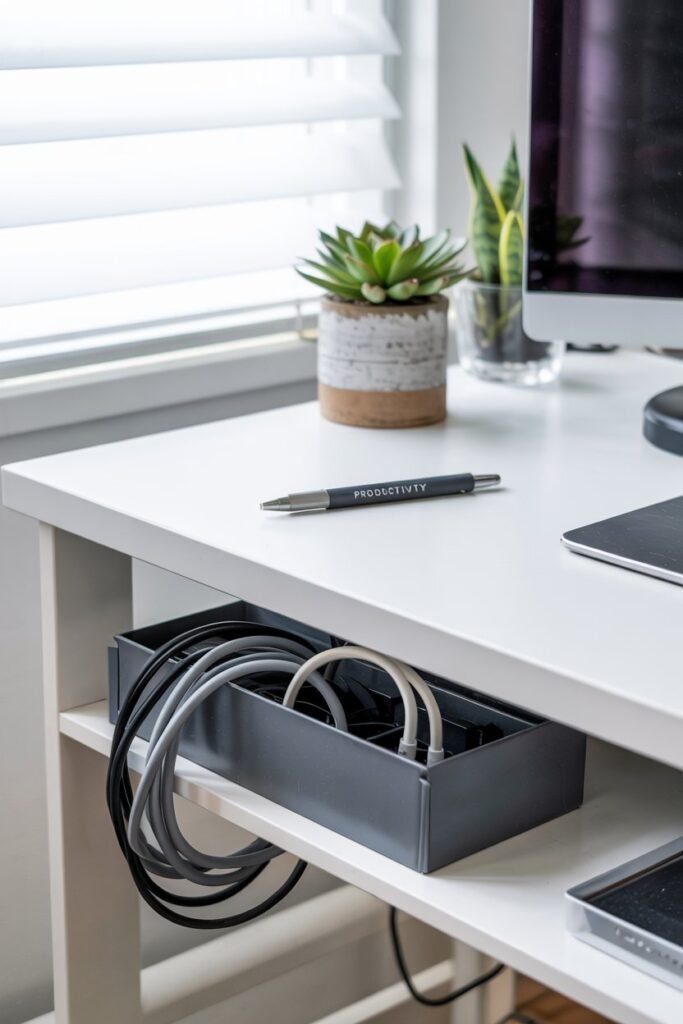 - Use a cable box under your desk to hide chargers, adapters, and power strips.