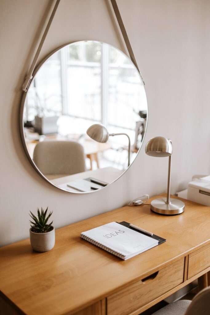 Mirrors bounce light around the room, brighten up dark corners, and make even the smallest workspace feel open and airy. Plus, they double as stylish wall decor without taking up valuable floor space.