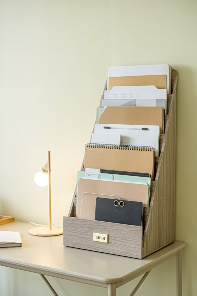- Use a vertical magazine rack to corral notebooks, planners, or laptops.