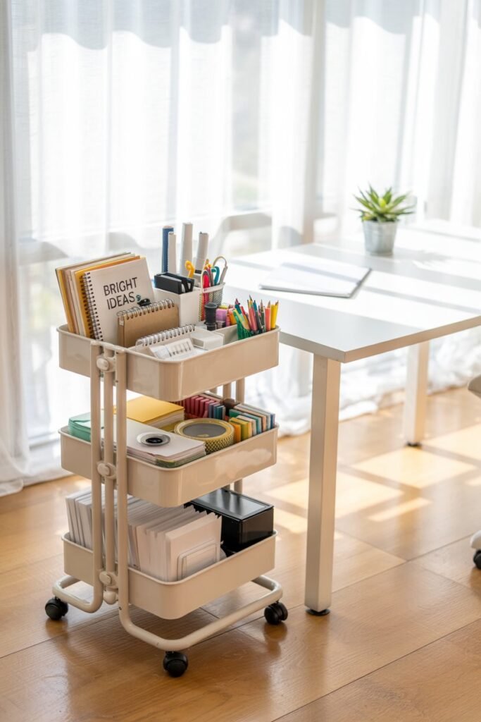 If you don’t have room for a big storage unit, a small rolling cart is a lifesaver. I keep one stocked with pens, notebooks, printer paper — all the little things that clutter up my desk if they don’t have a home.