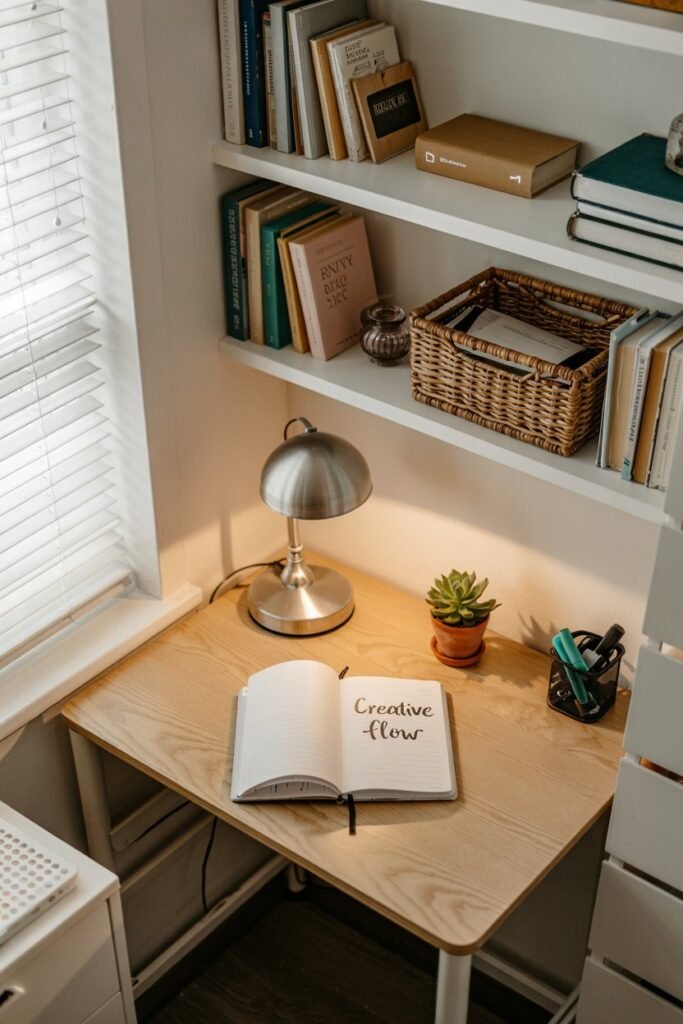 When your office is small, vertical storage is your best friend. I added a few floating shelves above my desk, and suddenly I had space for books, planners, and office supplies — all without crowding my desktop.
