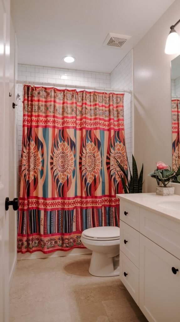 Look for vibrant colors, boho prints, or elegant minimalist designs to match your aesthetic. Choosing a fabric curtain instead of plastic gives a more upscale and cozy feel.