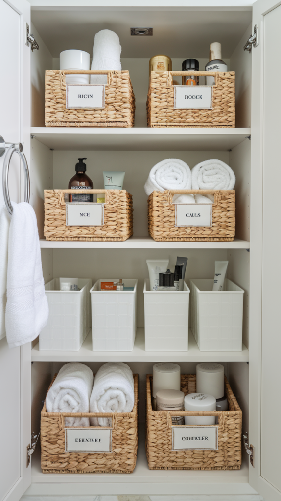 I like using woven baskets, simple bins, or soft fabric organizers to keep toiletries and everyday essentials neatly stored while still looking intentional and easy on the eye.