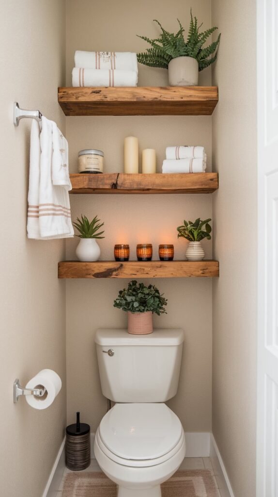 Storage is essential in a bathroom, and floating shelves offer both functionality and style.