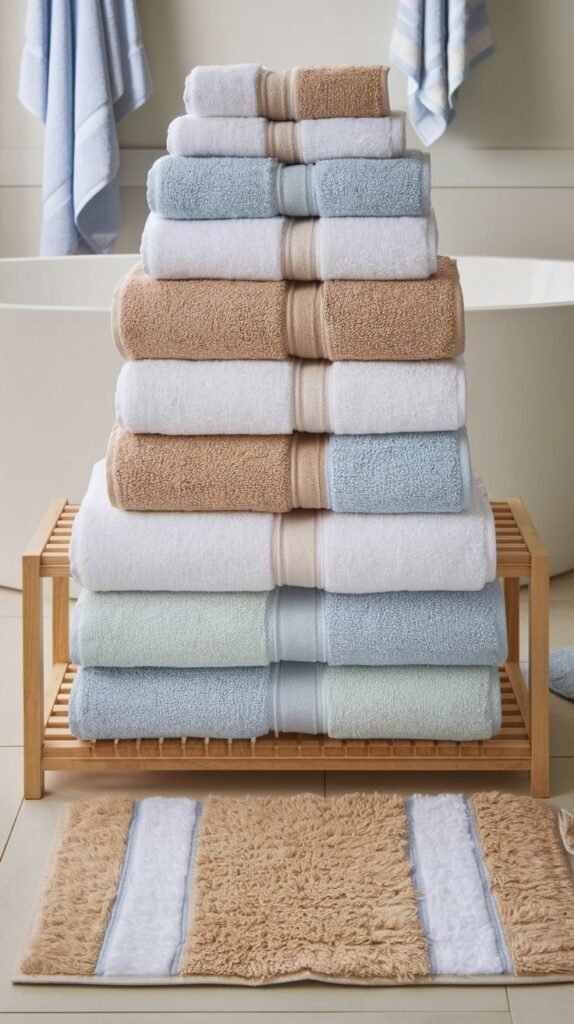 I always recommend choosing a color-coordinated towel set because it creates a calm, cohesive look that makes your bathroom feel more like a spa and less like an afterthought.