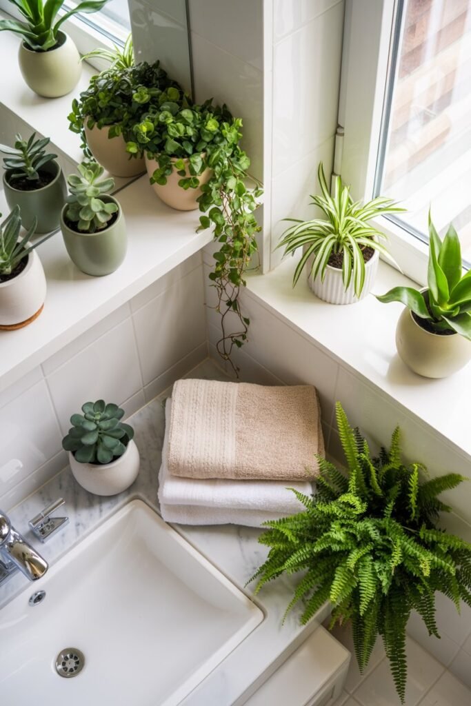 I find that the greenery not only makes the bathroom feel more inviting but can also help purify the air and brighten the space.