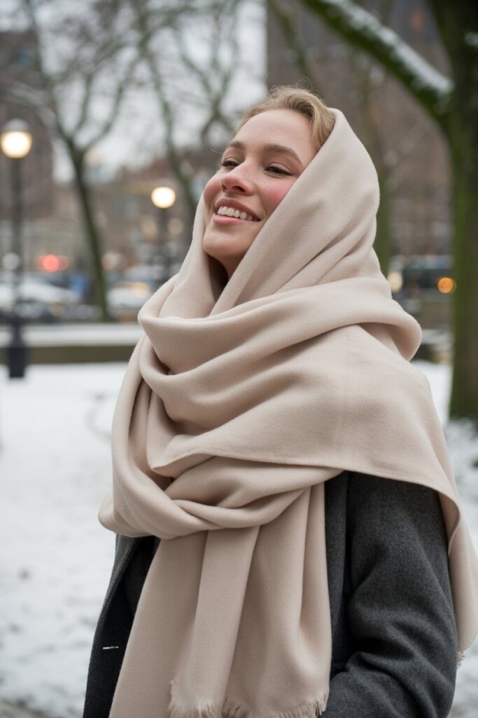 A soft scarf in a neutral color is both fashionable and functional. It keeps the neck warm during chilly days while adding a versatile touch to winter outfits.
