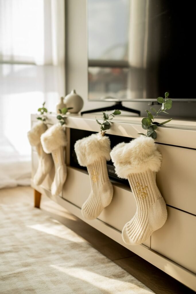 Stockings aren’t limited to fireplaces. Hanging them from your TV stand adds instant holiday personality. For families, personalize stockings with names. For a refined touch, choose knit, velvet, or faux fur designs in neutral or traditional colors. Add filler items like candy canes or greenery sprigs to make them look even more inviting.