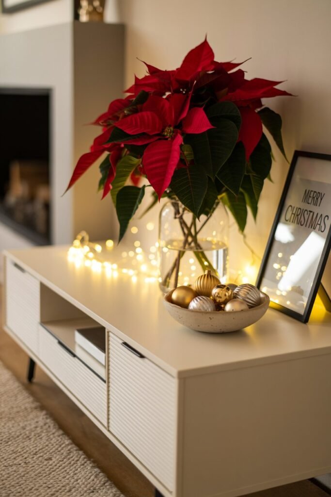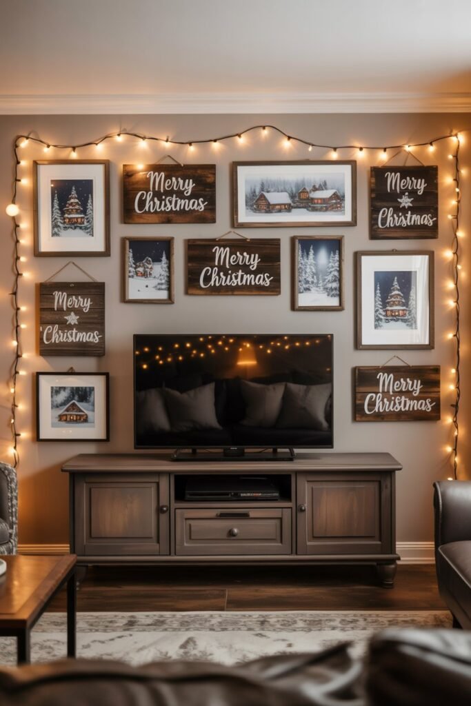 The wall above your TV stand offers valuable decorating space. Wooden holiday signs, framed prints, or metallic canvases with Christmas messages instantly extend the festive look upward.