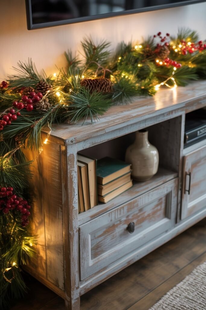 Garland is a timeless Christmas decoration and one of the easiest ways to dress up a TV stand. A thick pine or eucalyptus garland draped along the top or framing the screen instantly adds holiday charm.