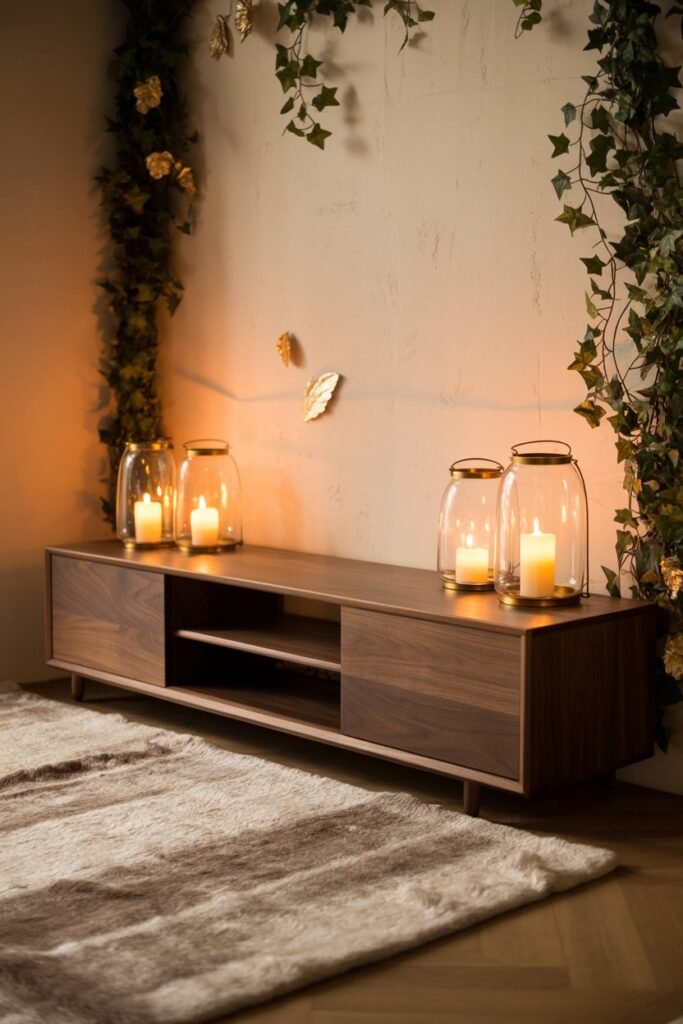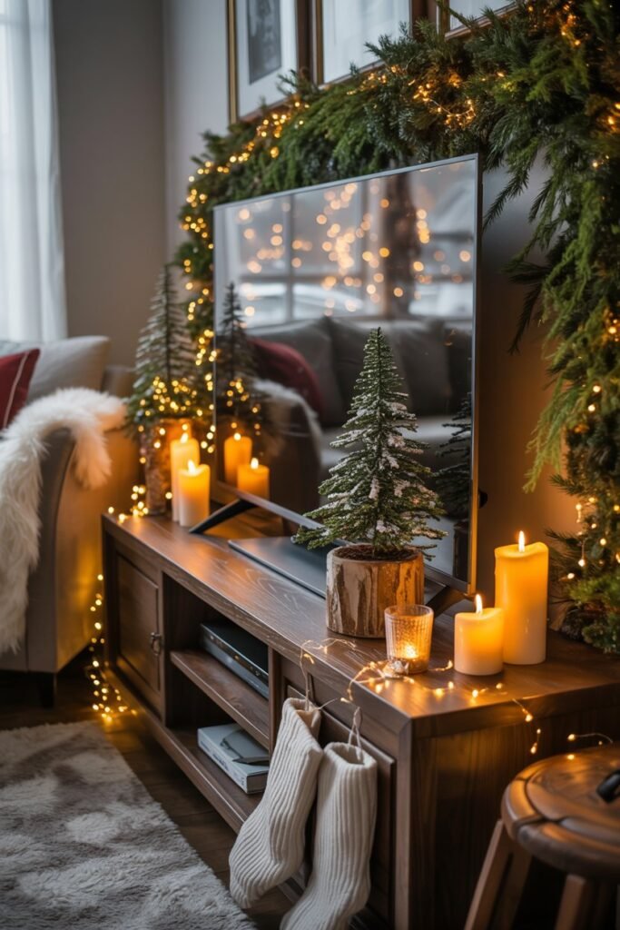 The glow of candles makes any room feel cozy and festive. Place flameless LED candles in clusters of varying heights on the TV stand, or arrange them in decorative lanterns. To reflect light and amplify the glow, use mirrored trays or metallic candle holders. Scented candles in pine, cinnamon, or vanilla also enhance the seasonal atmosphere.