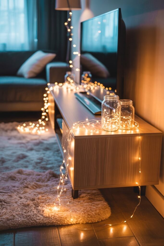 Curtain lights behind the TV can serve as a glowing backdrop, while LED strips provide subtle under-stand lighting. Warm white lights create a cozy glow, while multicolored ones give a playful feel.