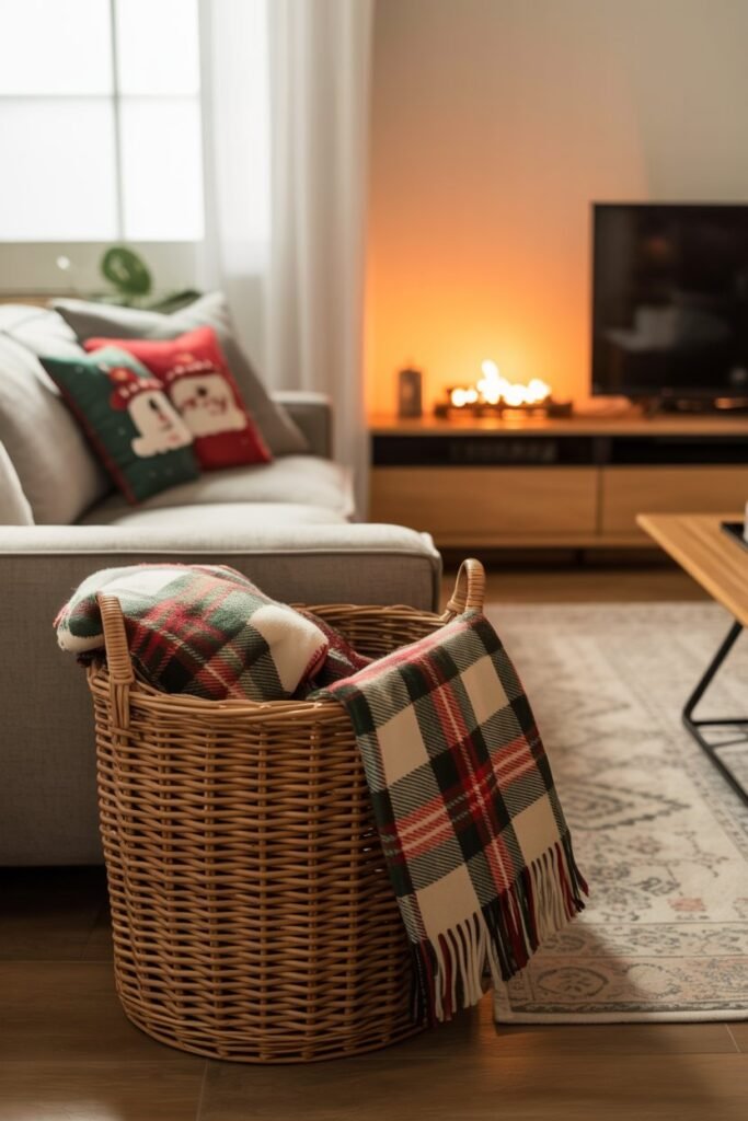Soft textiles bring warmth and tie the room together. Drape a festive throw blanket over one corner of the TV stand or place it in a decorative basket nearby.