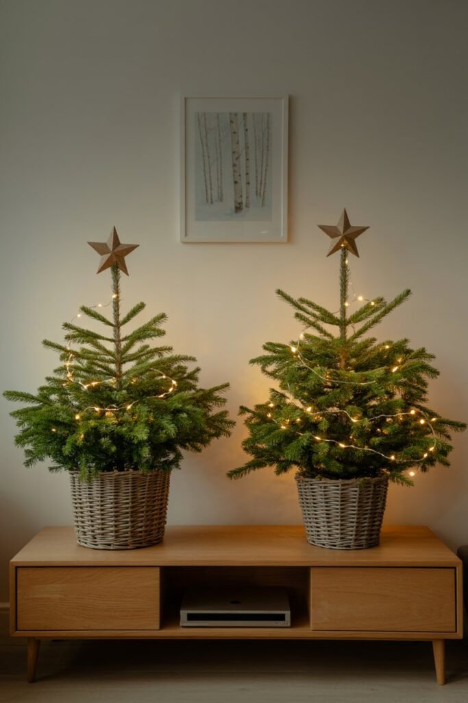 Keep them simple for a minimalist look or decorate them with mini ornaments that match your main Christmas tree. Decorative baskets or tree skirts at the base finish the look beautifully.