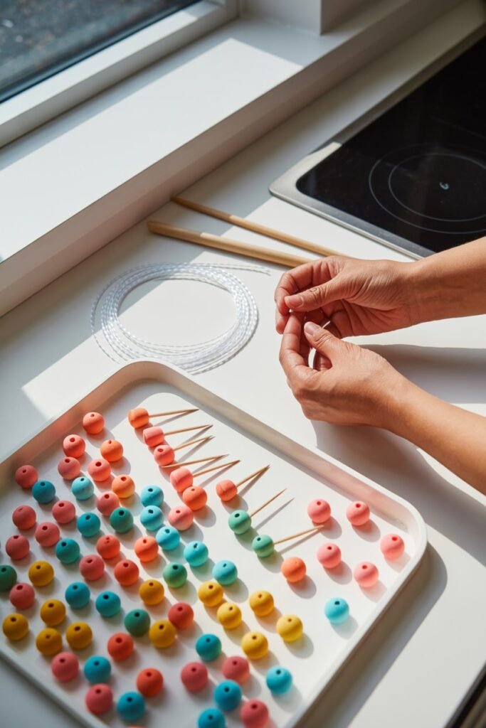 - Knead and soften the clay then roll small balls for beads, keeping sizes consistent