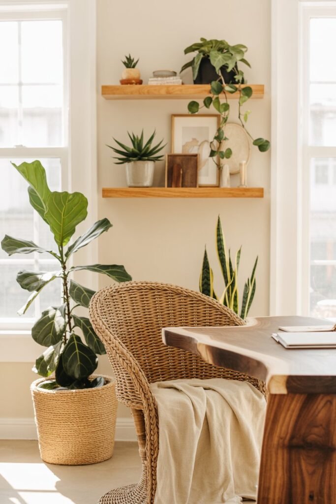 Place a tall plant in a woven basket beside your desk, or scatter smaller ones like pothos, snake plants, or succulents on shelves. If you don’t have great light, faux plants can still add texture and charm.