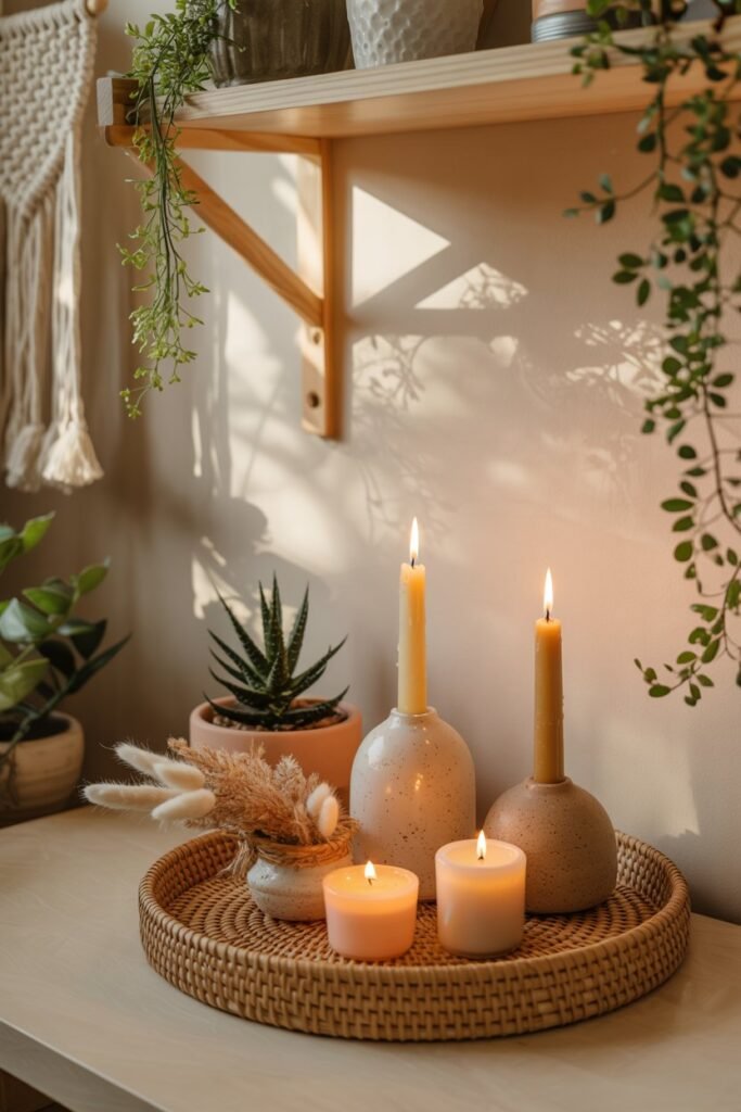 Choose earthy scents — sandalwood, vanilla, or eucalyptus — and place candles in ceramic or rattan holders. Keep them near your reading nook or shelf for warmth and charm.