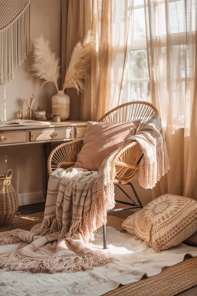 Layer a fringed throw over your chair, choose sheer linen curtains to filter soft light, and use patterned cushions for a relaxed, cozy atmosphere. Neutral colors — ivory, blush, sand, or sage — enhance that feminine boho charm.