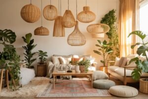 Opt for earthy tones — think beige, terracotta, soft pink, or muted mustard. Patterns inspired by Moroccan or tribal prints complement the boho aesthetic without overwhelming it.