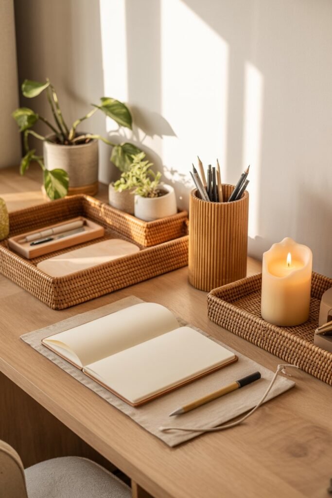 Combine wooden trays, ceramic mugs, woven organizers, and linen notebooks on your desk. Use muted tones — nothing too shiny or overly matched.