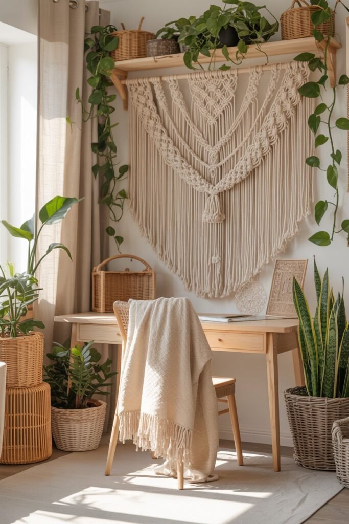 Nothing defines a boho home office like a touch of macramé. It adds artistry, texture, and warmth — transforming a blank wall into a cozy focal point.