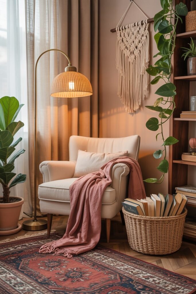 Place a small armchair or pouf beside a floor lamp and woven basket of books. Add a throw blanket, plant, and scented candle for a relaxing touch.