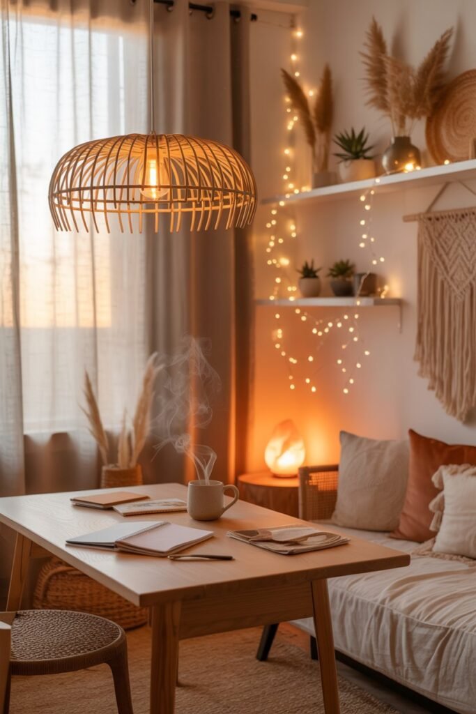 Choose a table lamp with a woven shade or a rattan pendant light. Layer it with fairy lights or a small salt lamp for added warmth and relaxation during late-night work sessions.